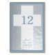 A table number for a boy's first communion, with dusty blue, white and faux silver colors. The number is dusty blue, in the center of a cross on faux silver foil background, In the lower part of the cross, there is smaller dusty blue text: the name in an elegant script, occasion and date in caps. The borders are also dusty blue.