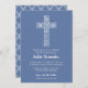 A white open weave cross on a blue gray background - CHANGE TO ANY COLOR - is ideal for your child's First Communion, Christening, Baptism or Dedication Invitations. Personalize with your son's name and the event details. Available in several shades of blue and lots of other colors or use our color picker tool to change to your perfect color. See MATCHING products in our store.