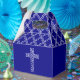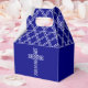 A white open weave cross on a navy blue background - CHANGE TO ANY COLOR - and a quatrefoil design on the top, these favor boxes are ideal for your child's Christening, Baptism, Dedication or First Communion celebration. Personalize with your child's name and other details on the back. Available in several shades of blue and lots of other colors or use our color picker tool to change to your perfect color. See MATCHING invitations in all other colors pre-made. ---> http://bit.ly/2GSK0No <---