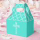 A white open weave cross on a turquoise background - CHANGE TO ANY COLOR - and a quatrefoil design on the top, these favor boxes are ideal for your child's Christening, Baptism, Dedication or First Communion celebration. Personalize with your child's name and other details on the back. Available in several shades of turquoise and lots of other colors or use our color picker tool to change to your perfect color. See MATCHING invitations in all other colors pre-made. ---> http://bit.ly/2GSK0No <---