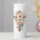 This pillar candle is shown with a watercolor art print of a cross accented with lovely flowers.