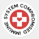 Compromised immune system sticker in white with a red circle in the middle with a white cross and a red heart.