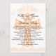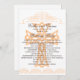 Cross themed wedding programs feature a cross design with calligraphy borders and multiple text fields that you can customize with your personal details on the front while the back has a damask pattern in orange.