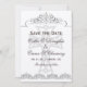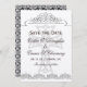 Cross themed wedding save the date cards feature a cross design with calligraphy borders and multiple text fields that you can customize with your personal details on the front while the back has a damask pattern in black and brown.