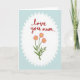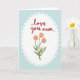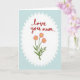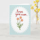 This greeting card features a crisp white oval at the center, edged with a scalloped border that resembles a lace doily, set against a soft pastel blue background. A faint cross-hatched texture runs through the blue area, giving it the look of cozy fabric or textured paper. Near the top inside the oval, a short message appears in flowing red lettering, positioned like a tender note meant for someone close ❤️. Beneath the words, three stylized flowers rise on slim green stems, their pink petals leaning slightly toward one another as if sharing a quiet moment. Each bloom has a sunny yellow center dotted with tiny specks, and the petals show fine line details that add depth without feeling busy. Small green leaves fill in the lower area, keeping the arrangement balanced and gently romantic 🌼. The red text sits above the floral cluster, while the blossoms and foliage stay neatly contained within the white oval frame. The scalloped white border stands out sharply against the pale blue field, with the subtle cross-hatching visible around all sides.
