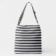 This stylish crossover body bag is shown in a cute black and white stripes print with black straps.
