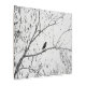 A black and white photograph of a black bird perched on a branch of a tree. The tree branches have seeds dangling from them. The branches and seed pods create an abstract background surrounding the little black animal. Photograph Copyright ©Kimberly J Tilley.