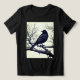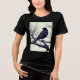 Tee in a black-and-white illustration featuring a sleek black crow perched on a gnarled, leafless branch. The bird's detailed feathers contrast sharply with the stark, skeletal tree limbs, creating a dramatic composition.
