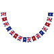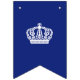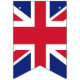 Patriotic British Union Flag called the "Union Jack" when flown. Red, white and blue. Celebrate the 2023 Coronation of King Charles III of Great Britain. Alternate flags in the bunting have white crowns on red or blue backgrounds.