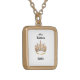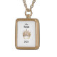 Gold plated and in a square shape this lovely necklace has in the center of it an image of a gleaming pageant queens crown in gold.