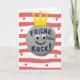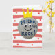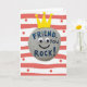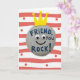 Designed with a friendly, cartoon-like gray pebble in the center, the card turns a simple stone into a sweet little character with a welcoming presence ❤️. A golden-yellow crown with three points and tiny round tips sits tilted on top, giving it a lighthearted, “you’re special to me” kind of charm. Just beneath the crown, two round googly-style eyes look straight out with an affectionate, attentive gaze, and a small curved black smile adds a gentle, companionable warmth. Across the front of the pebble, the text reads “FRIEND, you ROCK!” in bright blue, set in thick, easy-to-read capital letters that stand out against the speckled surface. The word “FRIEND,” sits higher on the stone, while “you ROCK!” follows below it, keeping the message centered and balanced. Behind the pebble, wide horizontal red-and-white stripes create a lively backdrop, and scattered small red dots add a confetti-like touch 🌼. The overall scene stays crisp and cheerful, with the crown’s yellow shining against the striped background and the pebble’s gray texture clearly visible. Small red dots are sprinkled across several stripes, with a few near the top left and others spaced out toward the right side.