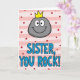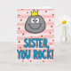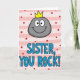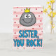 This design shows a rounded gray stone-like character wearing a jagged yellow crown, centered in the upper half as if proudly posing for someone it cares about ❤️. Its big white eyes with black pupils and a wide black smile give it a friendly, affectionate look, like it’s sharing an inside joke with a close sister or friend. Behind it, the background is filled with soft pastel pink horizontal stripes that keep the scene light and cozy. Scattered across the stripes are small red dots, spaced irregularly like confetti drifting through the air. In the lower half, the message “SISTER, YOU ROCK!” is set in bright blue, thick all-caps letters with a black outline, ending with a punchy exclamation point. The text sits centered beneath the character, balancing the crown above with the strong lettering below, and the overall layout feels like a cheerful cheer from one person to another 🌼. The crown is a saturated yellow with sharp zigzag points, standing out against the gray figure and the pink striped backdrop.