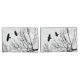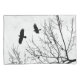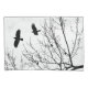 Crows flying together past a stark tree, small birds perched in its branches, in a mottled subtle white and grey sky. One Gothic scene is black and white and the reverse is grey and black. A Gothic landscape silhouette.