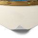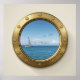 Shiny brass porthole on a light beige background with a view of the blue Caribbean sea.