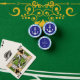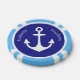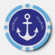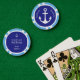 Cruise ship themed poker chips featuring a white ship's anchor on navy blue. All text on the front and back is customisable, so you can change the names and add your own message