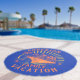 This personalized family vacation round beach towel shows a cruise ship, sun rays, a palm tree, and more nautical details. The color palette is orange and sunny yellow on a royal blue background with striped edges. All text can be easily changed through the templates, including your family name and the words "family vacation." You can also add the year or delete the sample text to leave that part blank. If you want to alter the fonts or need to adjust text size to fit, just customize / personalize further. You can also change the blue "background" color to any shade.