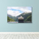 Canvas print of a big cruise ship in the narrow Geirangerfjord with big mountains lining the fjord, seen from the village of Geiranger in Norway.
