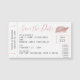 Miniature boarding pass cruise ship ticket save the date magnet to include with your destination wedding save the date suite features faux rose gold pink foil cruise ship with waves illustration and elegant retro modern fonts with space to add a custom cabin number by the barcode. These mini ticket magnets are the same size as a business card and do not come with envelopes unless you opt to add them. They are a perfect design to compliment any other save the date cards you are sending for your travel theme cruise destination wedding and guests will love them!