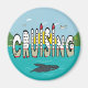 Cruising design uses the word "cruising" to create a cruise ship sailing to exotic foreign destinations across the blue seas. Includes sun, anchor, steam funnels and cabin portholes to create a fun graphic for fans of cruising vacations.
