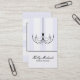 A business card featuring an illustrationof a crystal chandelier hanging from top over a background of light blue vertical stripes. Personalize with your name and job title over sheer section with black trim at bottom. Opposite side is viewed horizonally and features the same background as the front. Personalize with your information over sheer rectangle with black trim.