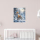 A graceful fox stands alert in fresh snow, enhanced with dazzling crystal formations across its tail, shoulders, and ears. Clear quartz textures, pale blue highlights, silver reflections, and subtle prism sparkle blend wildlife realism with luxurious fantasy design. Frosted pine trees, icy stones, soft dawn light, and drifting winter mist create a peaceful enchanted forest atmosphere. Elegant and collectible, this artwork is perfect for winter décor, woodland interiors, fox lovers, cozy cabins, and gift shoppers seeking refined animal wall art.