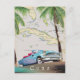 Illustrated map of Cuba (plus surrounding islands) in a beautiful vintage detailed style with a classic old cuban car in the sunset.