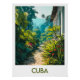 Vibrant illustration of a tropical path lined with lush flowers and palm trees in Cuba, with a colonial house in the background. A perfect poster for colorful and exotic wall decor.