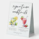 This Cuban signature cocktails table tent sign features simple black typography above 2 of your favorite drinks and their ingredients for your coastal wedding bar. A chic Mojito and Strawberry Daiquiri drawing add a fun flair to your bar menu. Complete with the couple's names and date for their reception.