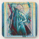 An artwork features a semi abstract woman with a shawl / veil in blue, white, and pink tones.