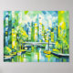 unique cubist painting of a lush green city with a modern bridge over a canal. The geometric forms and vivid shades enhance the dynamic urban feel.