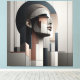 A modern abstract portrait constructed from geometric segments and muted tones, blending human expression with architectural structure. Angular shapes, layered forms, and a sculptural color palette create a contemporary, design‑driven artwork ideal for sophisticated interiors, studios, offices, and gallery‑style spaces.