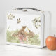 Modern white LUNCH BOX Sweet Playful Watercolor Bear lying down on some green grass in the forest woods land while smelling a wild flower.