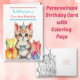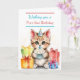 Cute birthday card for girls. Cute for a child or adult. A cute kitten holding a cupcake surrounded by birthday gifts. You can customize the card by adding a name in the personalize area. Cute puppy and birthday pun inside along with a coloring page.
