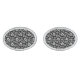 Cufflinks shown in a silver tone rhodium plated oval shape with a black and white flowers print.