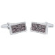 Cufflinks shown in a silver tone rhodium plated rectangle shape with a paisley print in colors of black and pink.