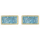 Cufflinks shown in a gold tone plated rectangle shape with a blue paisley print.