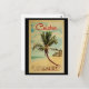 A uniquely retro mid-century modern Culebra Puerto Rico art print in vintage travel poster style. It features a curved palm tree on sandy beach with ocean under a blue cloudy sky.