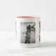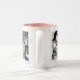 Photo mug with decorative border has room for three of your favorite photographs. Each photograph is framed with white and there is a shooting star themed background . Shown in white with pink inside and black and white enhanced photographs. HAMbyWhiteGlove aka HAMbWG