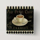 © Daphne Brissonnet / Wild Apple. A hot cup of cappuccino with a saucer and teaspoon. The black background has French words written on it.