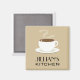 A kitchen magnet featuring an illustration of a hot cup of coffee on a saucer. Personalize with your name. Look for matching items at Jill's Paperie.
