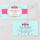 © 2021 Socialite Designs Inc. Cupcake, pink cookie and cake pops business card design with a bright pink polka-dot ribbon and vibrant turquoise pattern background. A pink cupake, flower-shaped cookie and two cake pops are inside a lace/scalloped text banner where you can add your bakery business information. The back adds an area for more information about your business.