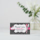 Pretty bakery business card done in a black and white polka dot background, with a pink bold band, across the middle, and a decorative black edged white text area, on the front. Whimsical graphics of pink, white, and black cupcake decorates the left side, of the card and pink and white spoons on the right side. Text is fully customizable to suit your business needs. Great for at home bakers too.