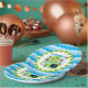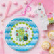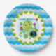 Cupcake Octopus 3rd birthday party paper plates features a green and blue smiling octopus holding birthday cupcakes and balloons, text that reads Look Who's 3, and a wide background border of blue ocean waves! These cute octopus 3rd birthday paper plates are perfect for the birthday party whether a big celebration or a small get together!