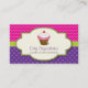 This bright and whimsical cupcake business card is sure to get attention. The cream colored frame holds the chocolate cherry-topped cupcake with pink and white frosting and a business name and description. It sits against a colorful pink chevron and purple polka dot background. The reverse reveals the cupcake close up next to a cream panel containing the business information. Available in alternate colors with matching products.