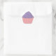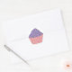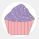 A cupcake with purple frosting and heart sprinkles on a sticker