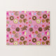 Colorful graphic print jigsaw puzzle featuring donuts, cupcakes and gingerbread men. On a pretty pink background. Lovely gift idea for anybody who enjoys baking, or simply loves cakes.