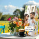 Cupcakes and flowers pattern wedding anniversary photo Roasted Coffee box. This vibrant and cheerful design showcases a delightful pattern of illustrated cupcakes and charming floral accents in a lively mix of pink, yellow, blue, and green. The centerpiece of this design is a cherished, personalized photo of the newlyweds, making it an incredibly sentimental presentation. The front of the box is adorned with the heartwarming quote, "Bold love, smooth mornings," a beautiful sentiment for their new life together. Completing the theme, the flap features the witty and romantic phrase, "Roasted for romance," hinting at the high-quality coffee inside. This is more than just packaging; it's a beautiful keepsake that celebrates their love and their shared future, one delicious cup at a time.