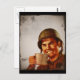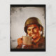 Vintage image of smiling soldier wearing a helmet and holding a tin cup full of coffee in his hand.