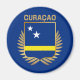 The national flag of Curacao is infused into a faux gold rimmed shield shape, which itself is resting upon faux gold leaves.