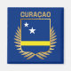 The national flag of Curacao is infused into a faux gold rimmed shield shape, which itself is resting upon faux gold leaves.